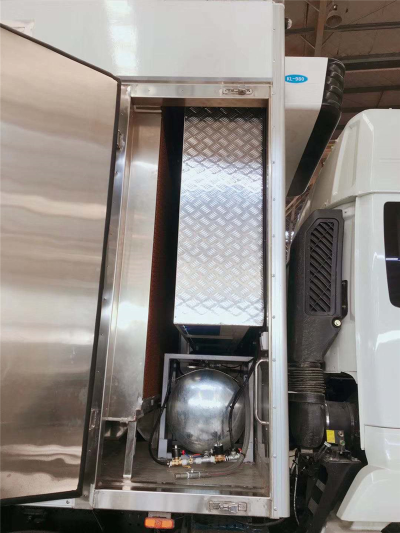 【豬苗車】上裝配置:外玻璃鋼,內(nèi)不銹鋼,兩層液壓升降層板,尾部液壓翻轉(zhuǎn)上豬平臺,層板為不銹鋼骨架鋪鋁花紋板。外部電動升降窗,排氣扇,柴油發(fā)電機,暖風(fēng)加熱,喂水系統(tǒng),凈水箱、污水箱,箱內(nèi)攝像頭監(jiān)控,倒車影像,凱利制冷機組。(油暖加熱為選裝部件)