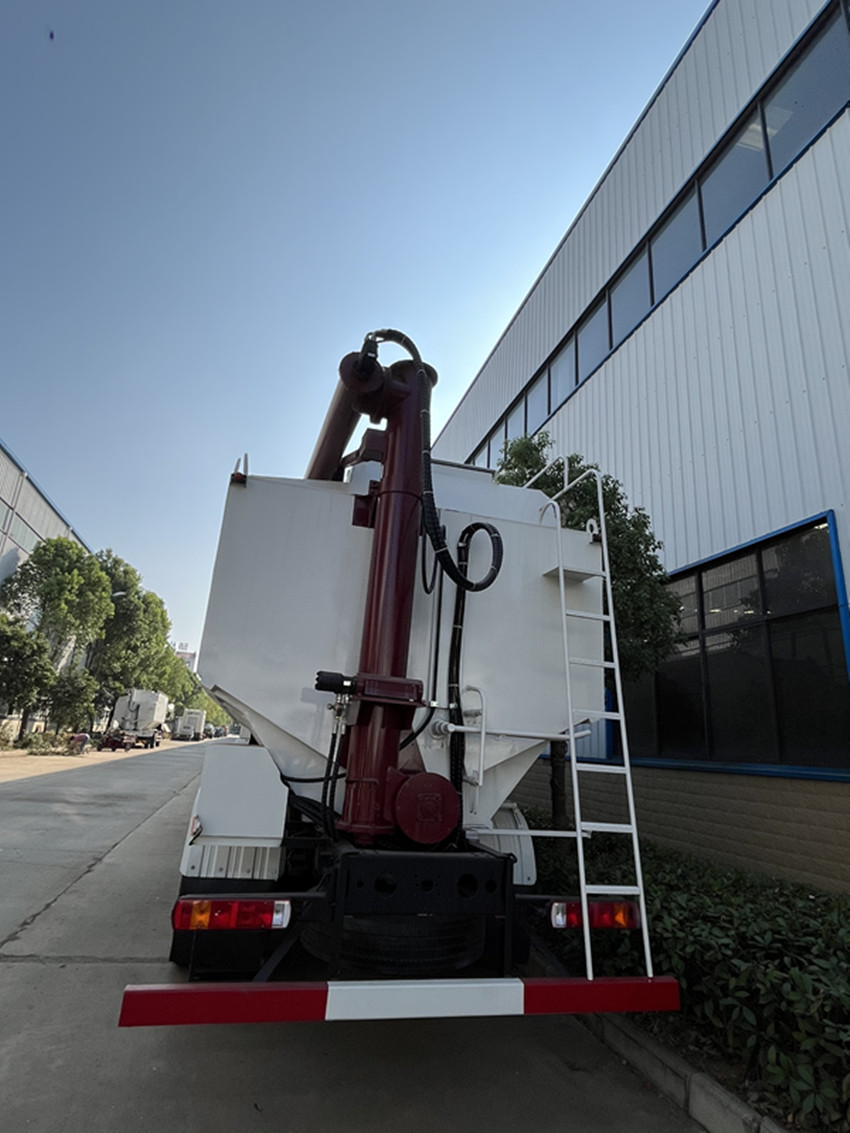 散裝飼料運(yùn)輸車,散裝飼料車的飼料罐架設(shè)在卡車的底盤上,罐頂開有進(jìn)料口.頂部的一根螺旋輸送卸料管(俗稱卸料絞龍)則可自由回轉(zhuǎn)和抬升,抬升的仰角可達(dá)60度。運(yùn)輸時(shí),頂部的螺旋管平臥在罐頂;卸料時(shí)則抬起,使管端的出料口與畜禽飼養(yǎng)場(chǎng)貯料罐頂部的進(jìn)料門相接,駕駛室內(nèi)裝有操縱裝置(操縱裝置也可裝置在罐體尾部),卸料時(shí)通過車底的動(dòng)力輸出軸和減速器來驅(qū)動(dòng)螺旋,以完成卸料。