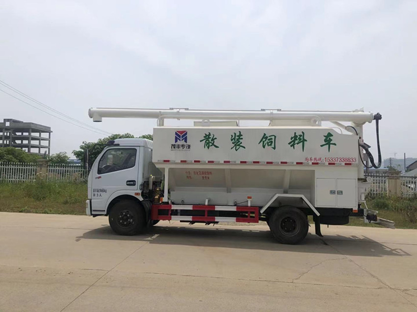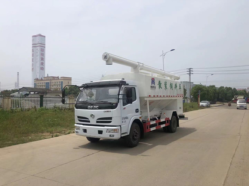 散裝飼料運(yùn)輸車(chē),散裝飼料車(chē)的飼料罐架設(shè)在卡車(chē)的底盤(pán)上,罐頂開(kāi)有進(jìn)料口.頂部的一根螺旋輸送卸料管(俗稱卸料絞龍)則可自由回轉(zhuǎn)和抬升,抬升的仰角可達(dá)60度。運(yùn)輸時(shí),頂部的螺旋管平臥在罐頂;卸料時(shí)則抬起,使管端的出料口與畜禽飼養(yǎng)場(chǎng)貯料罐頂部的進(jìn)料門(mén)相接,駕駛室內(nèi)裝有操縱裝置(操縱裝置也可裝置在罐體尾部),卸料時(shí)通過(guò)車(chē)底的動(dòng)力輸出軸和減速器來(lái)驅(qū)動(dòng)螺旋,以完成卸料。